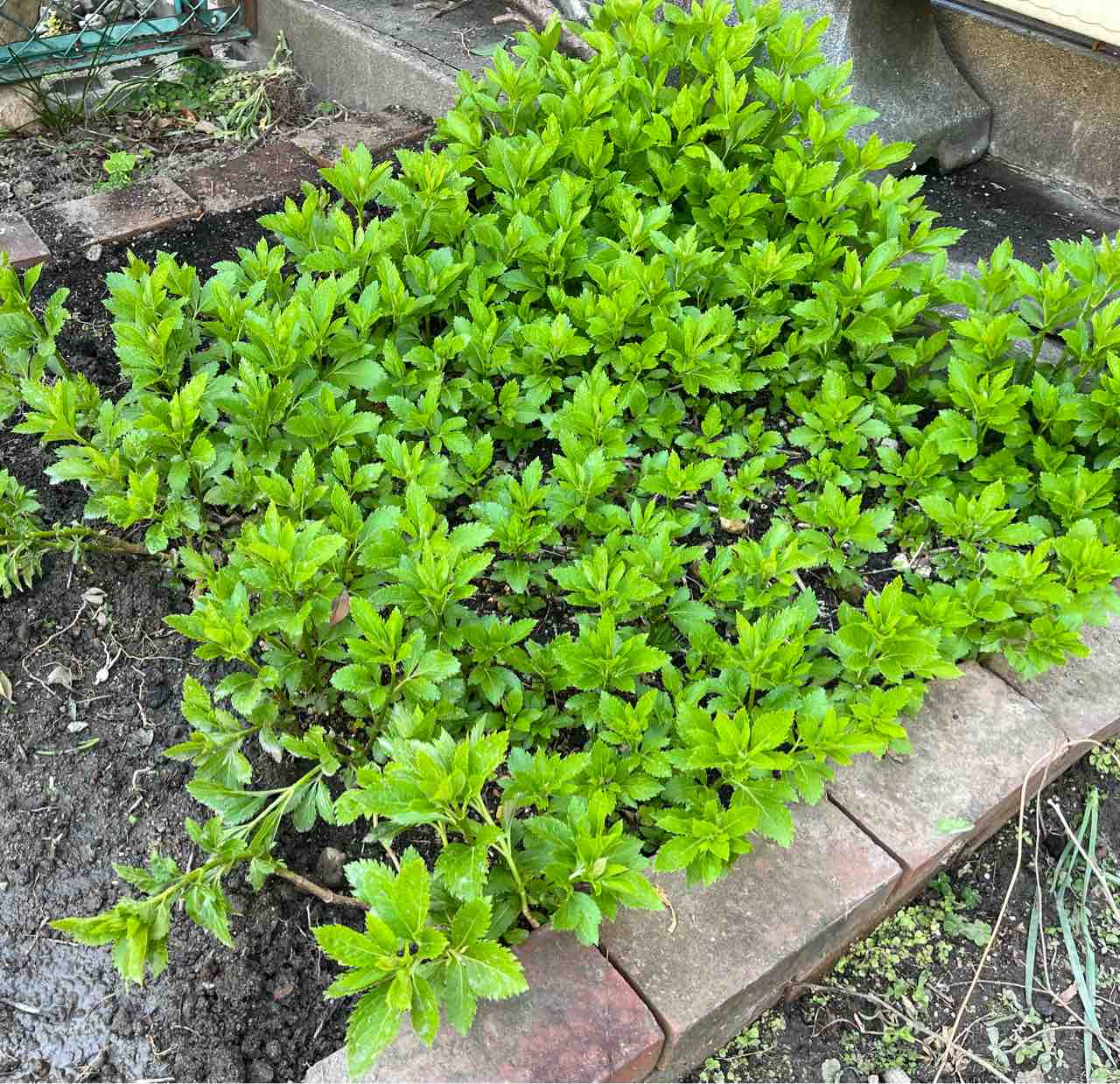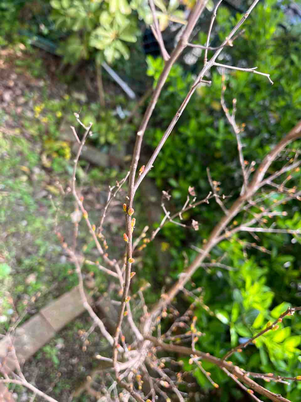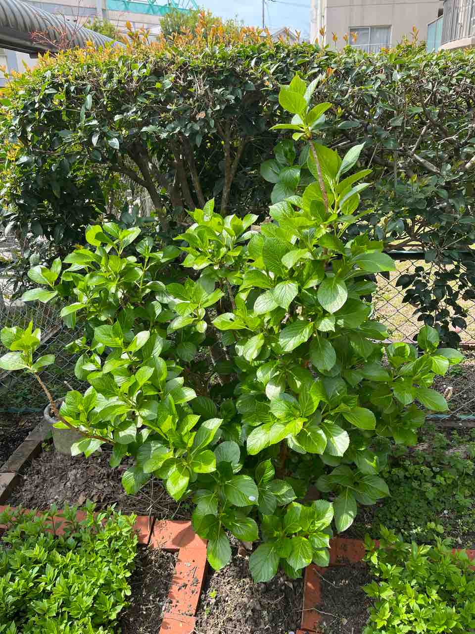 4年目の栽培を始めたフジバカマの様子を確認。植え替えたばかりの生垣の苗木を固定。ますます大きく育ちつつあるアジサイと芽吹き始めたサルスベリとに目を細める(笑)。