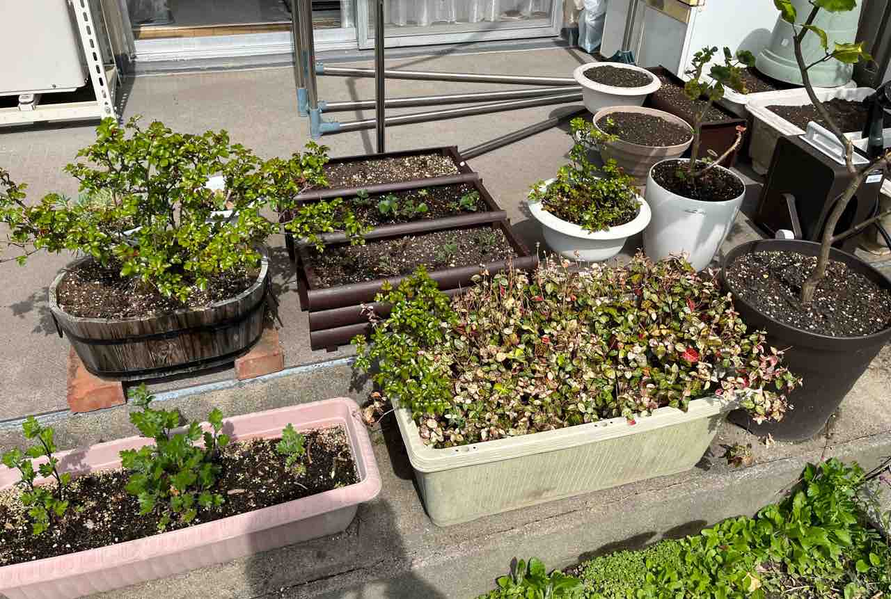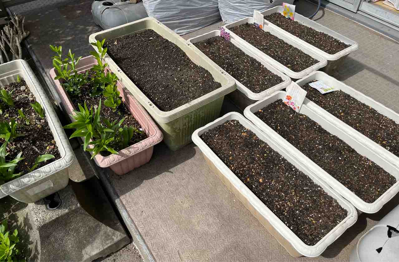 夏から秋に花を開かせるであろう草花の種はプランターに撒きました。傷んではいけないので余った土もプランターに盛っておきました。