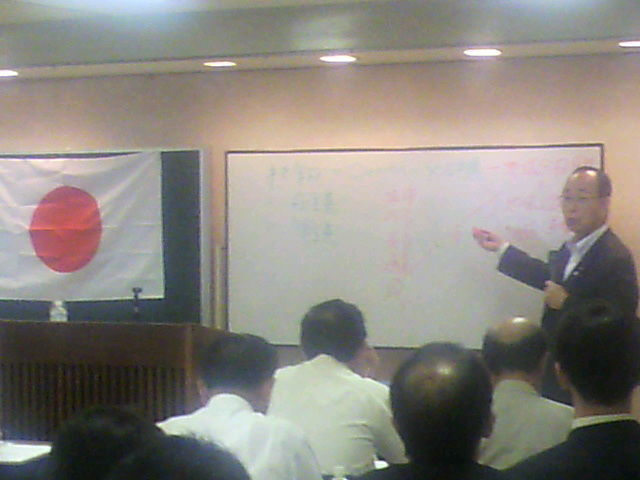 ゲスト講師はみんなの党最高顧問・参議院議員の江口克彦さん( http://www.eguchikatsuhiko.com/ )。演題は「地域主権型道州制~関西州への展望」でした。PHP総合研究所前社長の江口さんは松下幸之助のもとで23年間、側近として務めました。松下が主張した「廃県置州論」を発展させ「地域主権型道州制」を提唱しておられます。松下政経塾第20期生のはたなかさんとは同じ松下門下生と言ってもいいでしょう。