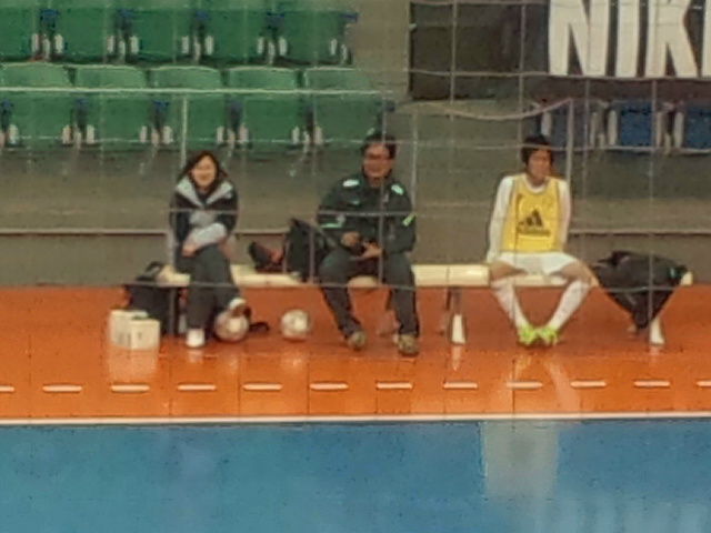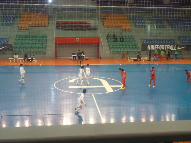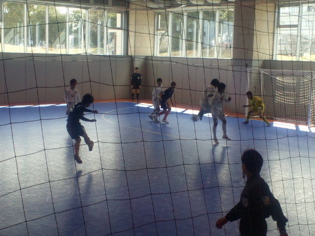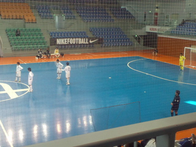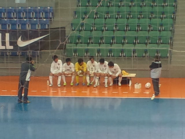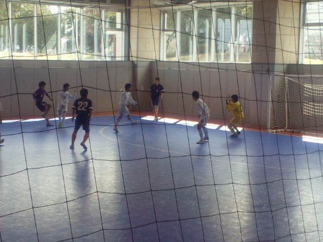 京都橘は、フットサルの経験がほとんどない選手ばかりで、この競技に慣れるのに時間を要しました。特に、コートが狭いことによるスピード感と、それから、ボールをキープし続けることがほとんど不可能で攻守が目まぐるしく入れ替わる展開には、最初のうちついていけませんでした。さらに、フットサルは体力の消耗が激しく、多数の選手を擁しどんどんメンバー・チェンジしてくるチームと比べると交代要員1名の京都橘はしんどかった(汗)。前半終わって「京都橘 0-3 国学院久我山」。