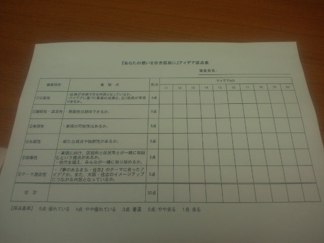 9月12日付「やすとログ」( http://log.yoshidayasuto.jp/archives/4181064.html )でご案内した「『夢あるまち・住吉』を一緒に実現しませんか? あなたの想いを住吉区政に 住吉区『予算策定への住民参画』 ~皆さんのアイデアを募集します~」、すなわち、「平成25年度住吉区予算『政策公募』」を昨日25日(火)に締め切りました。20提案のご応募がありました。市長へ報告した計画段階での目標応募数10提案を大きくクリアしました。経験則から語りますと、とても多い件数の提案があったと言えます。区内在住・在勤・在学者でないと応募できないこと、財務計画も記載すること、現住所(勤務先)、氏名、連絡先を明記しなければならないことなどを勘案すると「とても多い」件数です。過半は行かなかったものの、区役所職員にも健闘してもらいました。