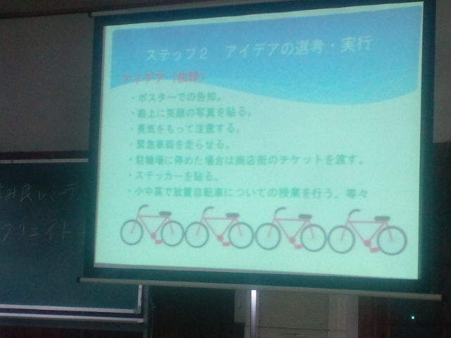 9月15日付「やすとログ」( http://log.yoshidayasuto.jp/archives/4187941.html )でその表彰式をご報告した社団法人大阪青年会議所(JC)つながりクリエイト事業「放置自転車アイデア選考」の最優秀賞「チャリズエンジェルなどゆるキャラを使った啓発事業」。アイデアを実現する日を迎えました。9月8日(土)、地下鉄御堂筋線・あびこ駅前で同啓発事業を実施しました。啓発事業に先立って事業報告会を我孫子会館で行いました。