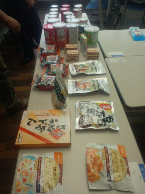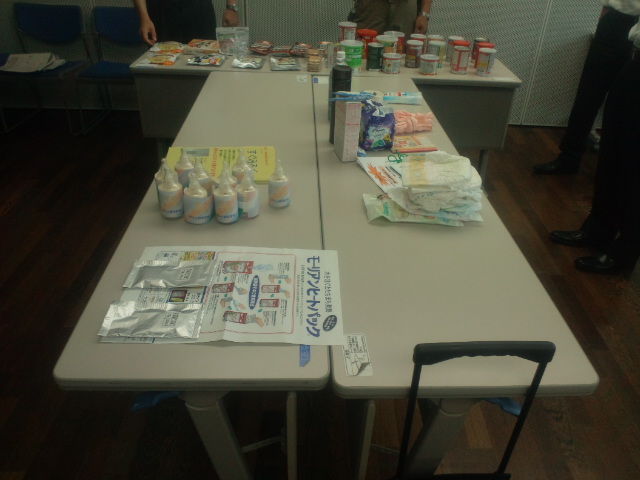 写真はセミナー会場に展示した災害時お役立ちグッズです。