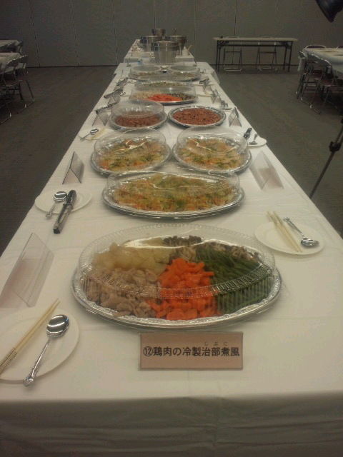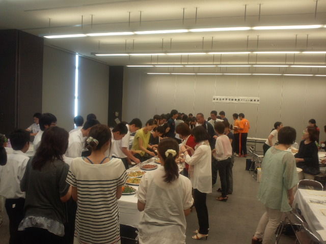 当日参加者は、大阪市立三稜中学校の先生、生徒、ならびに、住吉区PTA協議会役員のかたがたです。大皿などで提供された主菜および副菜を12種類、それぞれ少量ずつ試食の後、感想をアンケートにより回答していただきました。