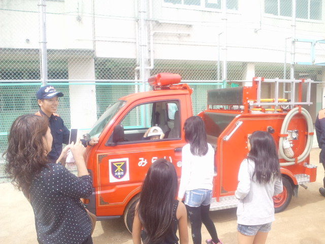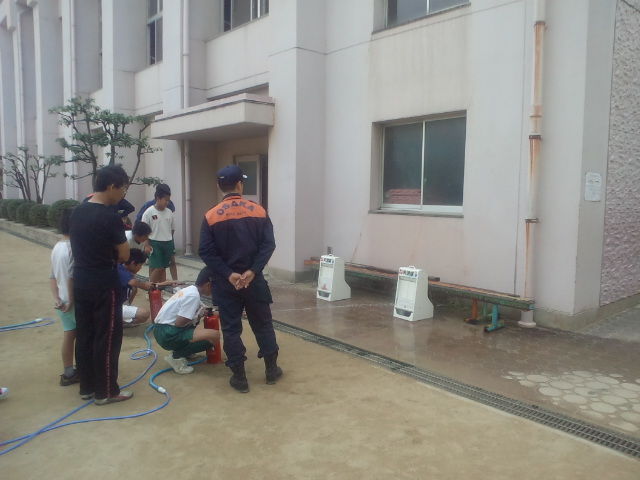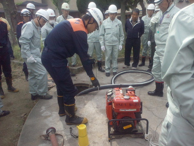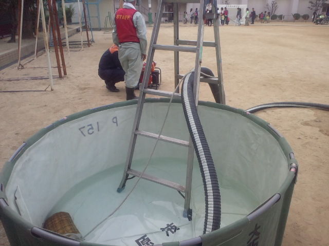 同公園内貯水槽からポンプアップした水で模擬消火。