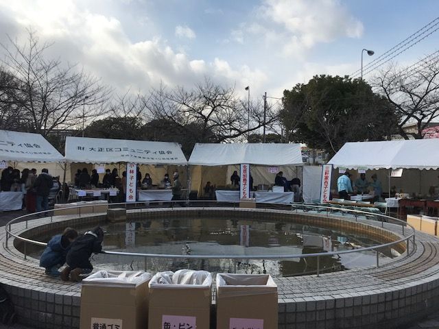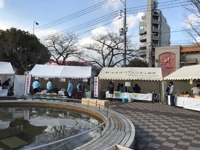 お昼前後は、大正会館前噴水広場に設置された各ブースが大勢の参加者で賑わっていました。