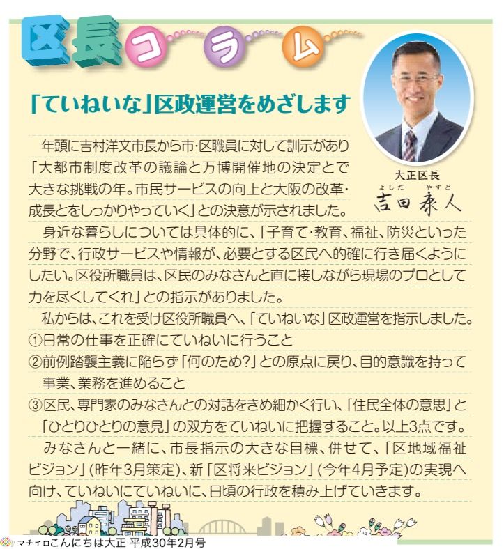 毎月連載している「区民だより こんにちは大正」の「区長コラム」。今月2月号は区政運営の今年一年間の行動規範について述べています。