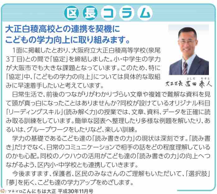 さて、毎月連載している「区民だより こんにちは大正」の「区長コラム」。遅くなりましたが、11月号、12月号まとめてご報告します。