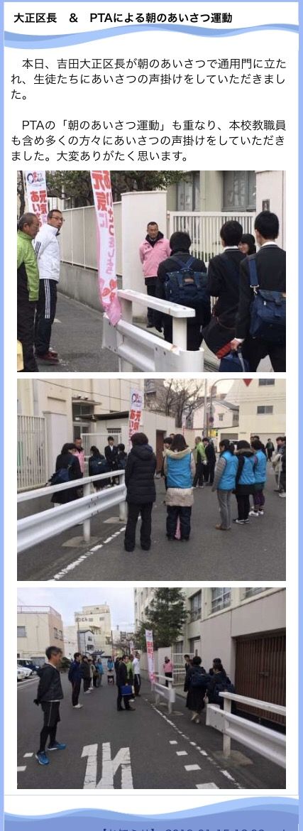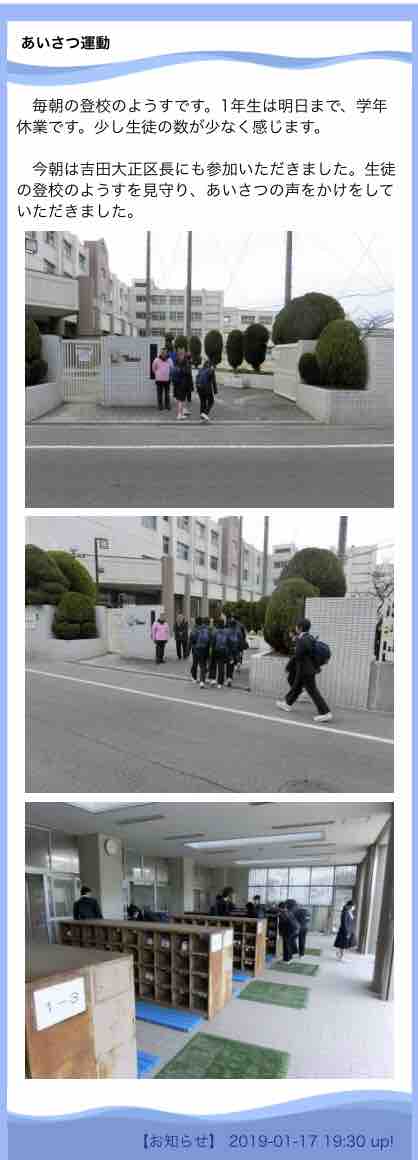 今週は大阪市立大正北中学校での朝のご挨拶。同校のホームページ(