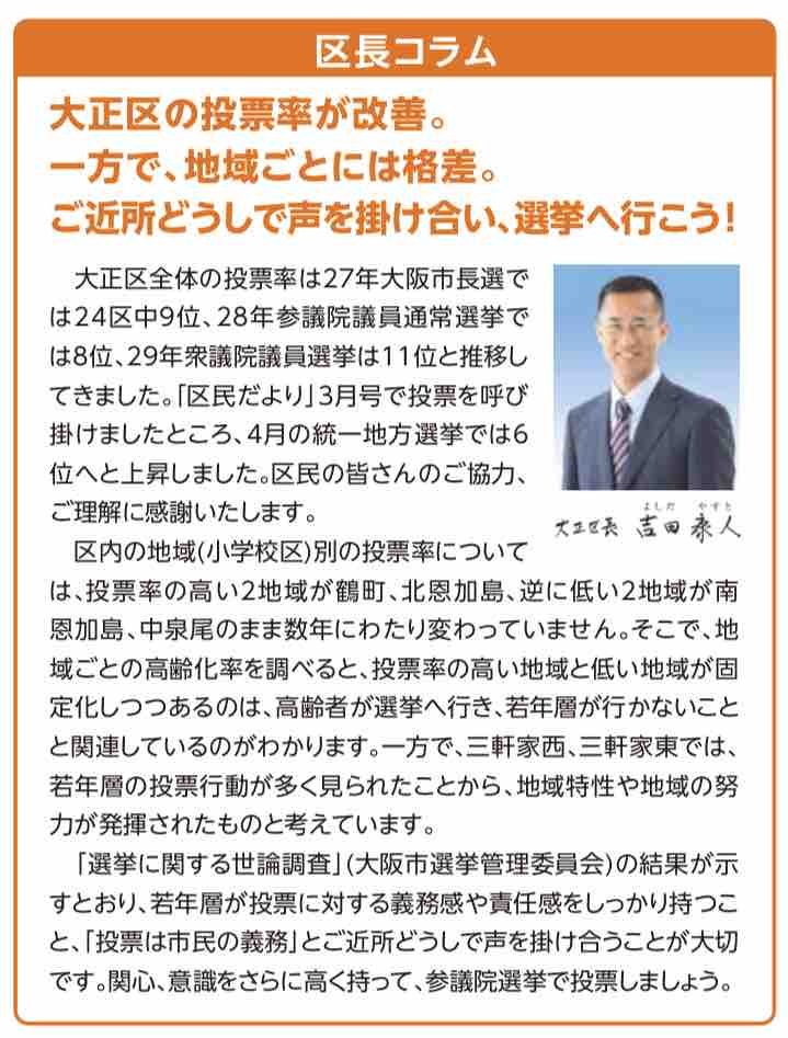 毎月連載している「区民だより こんにちは大正」の「区長コラム」。今月7月号は今週末に迫った参議院選挙について述べています。