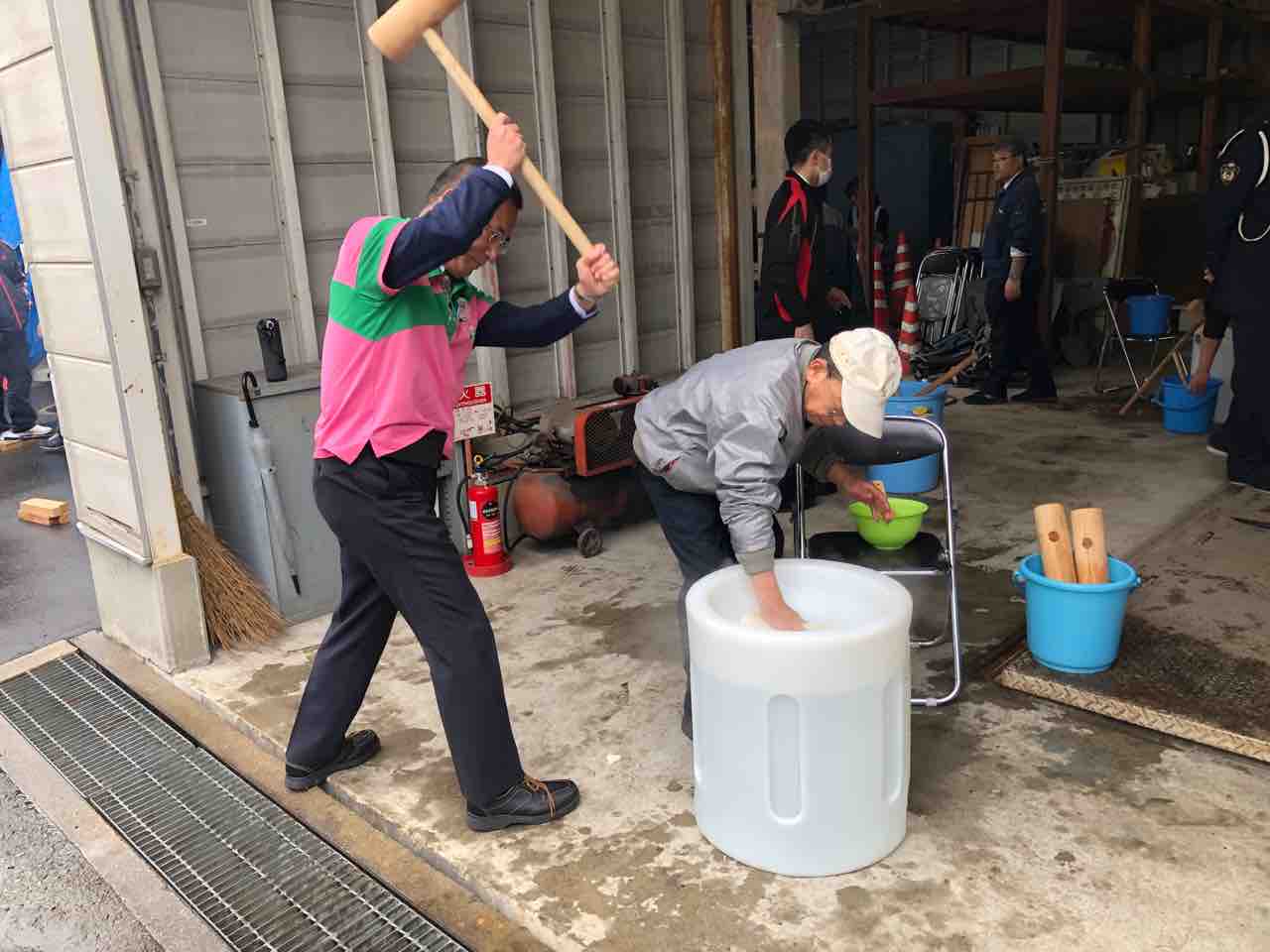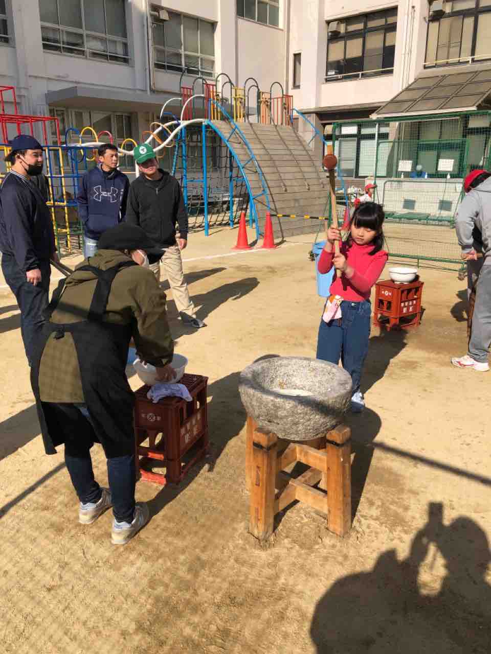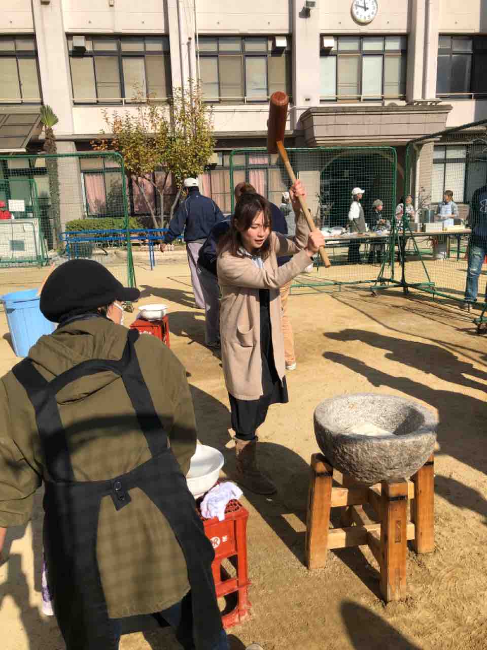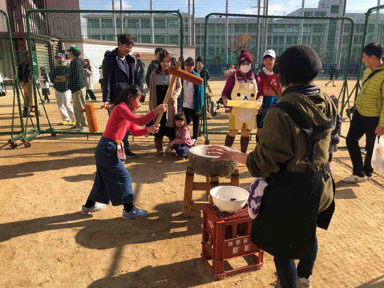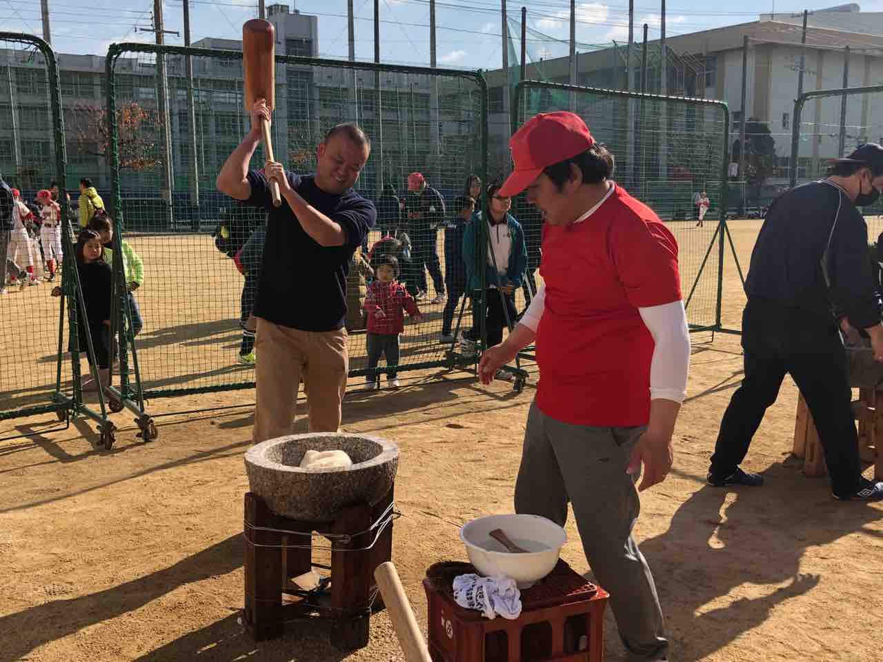 12月8日(日)、防災訓練の泉尾北小学校を出て大阪市立中泉尾小学校校庭へ。中泉尾地域の「もちつき大会」に遅れて参加。お餅も少し、食べた分くらいは(笑)、つかせていただきました。