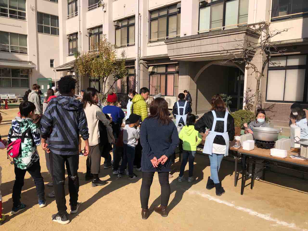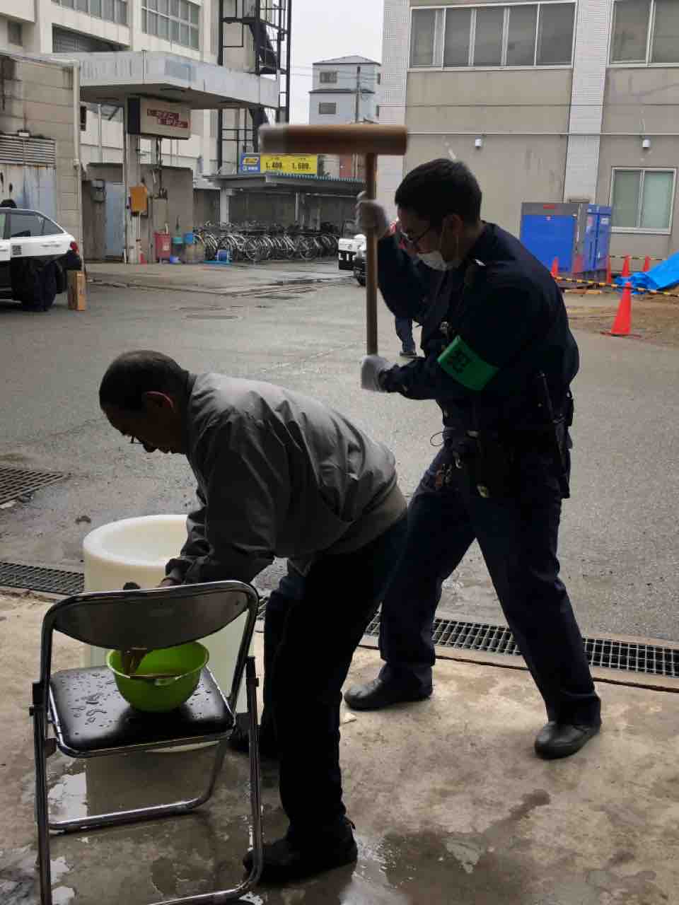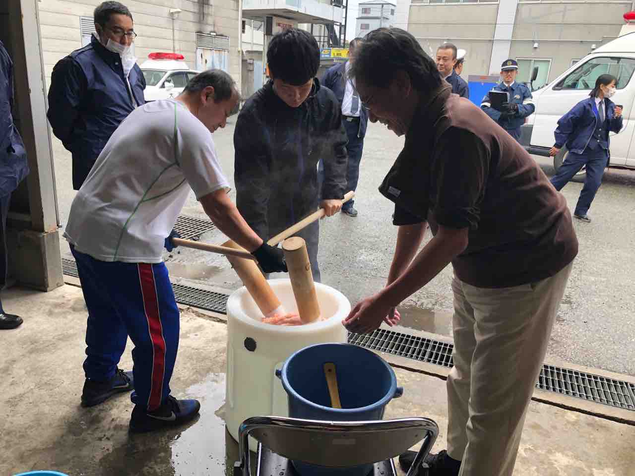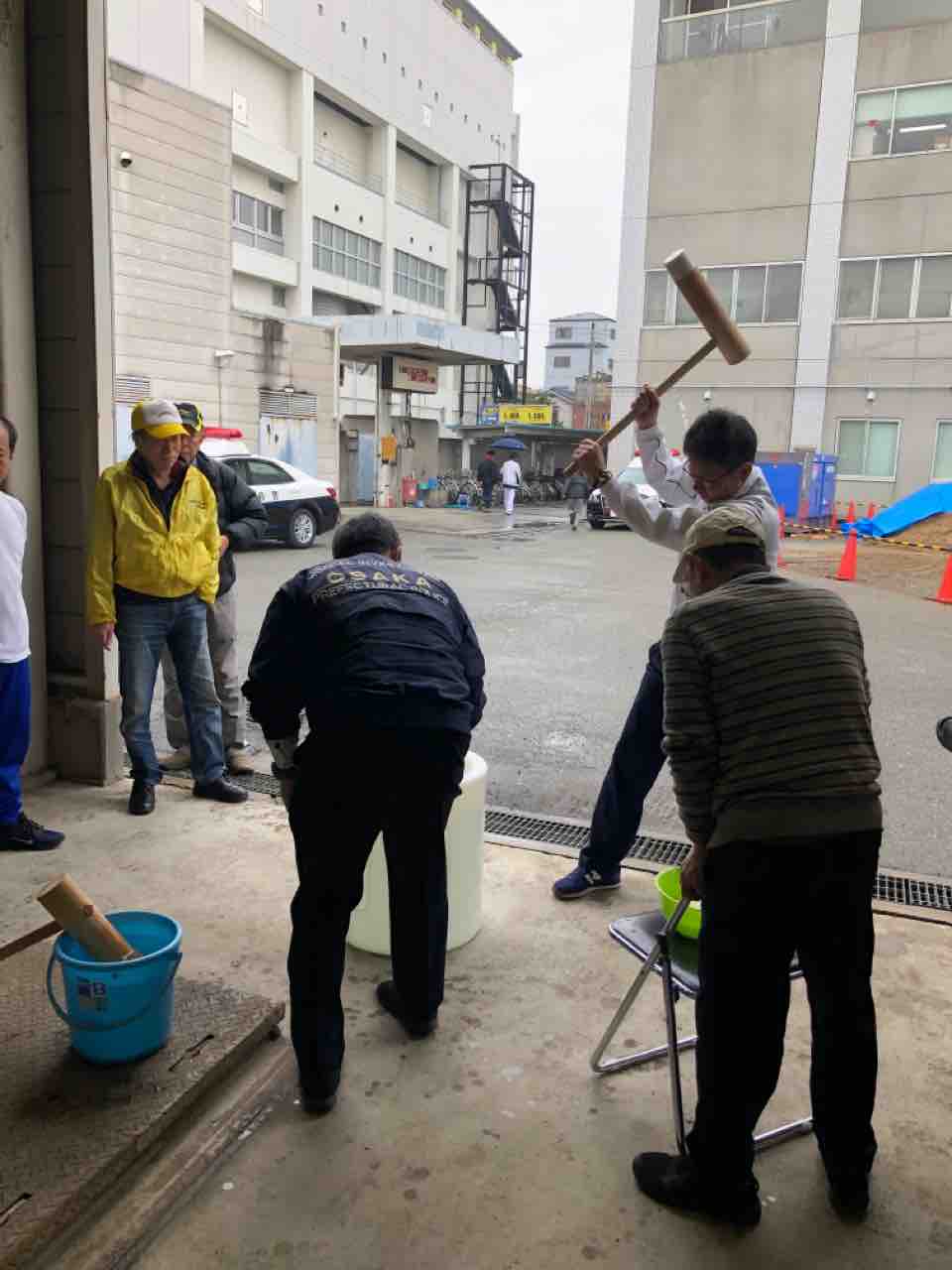 12月8日(日)、防災訓練の泉尾北小学校を出て大阪市立中泉尾小学校校庭へ。中泉尾地域の「もちつき大会」に遅れて参加。お餅も少し、食べた分くらいは(笑)、つかせていただきました。