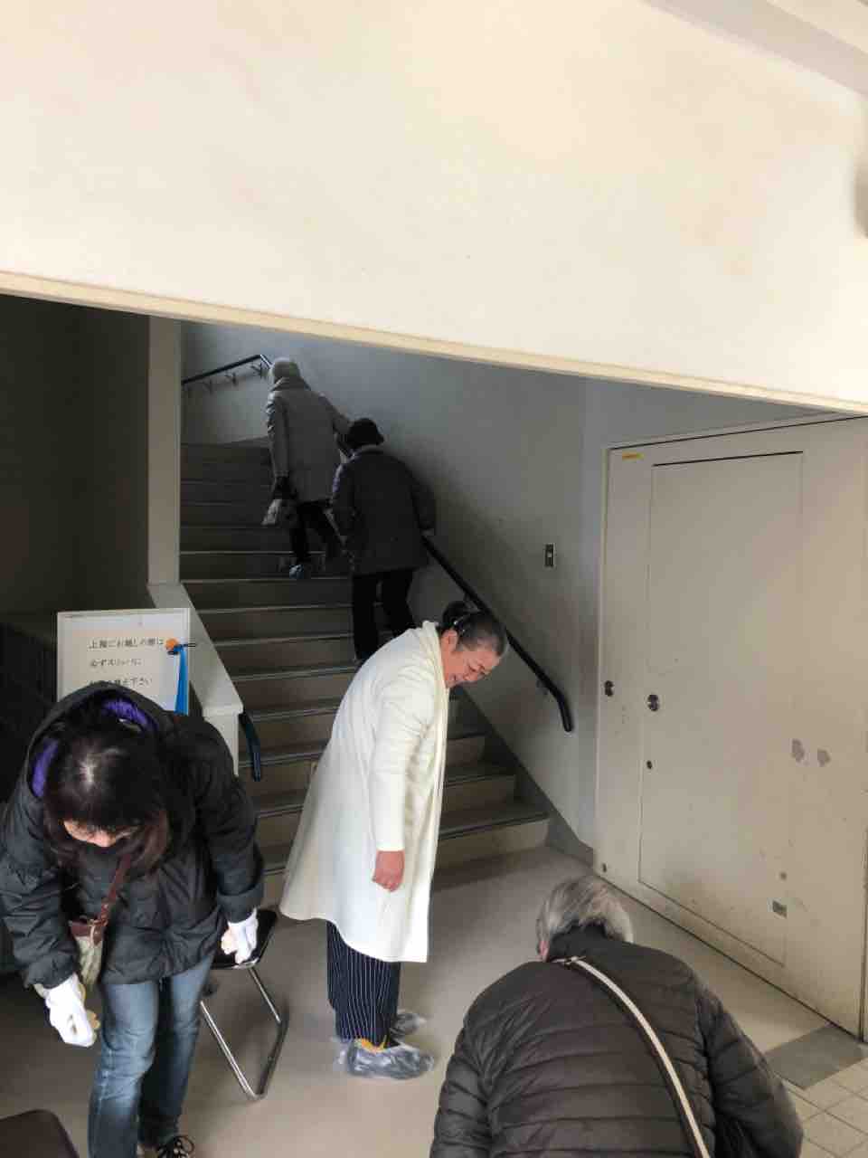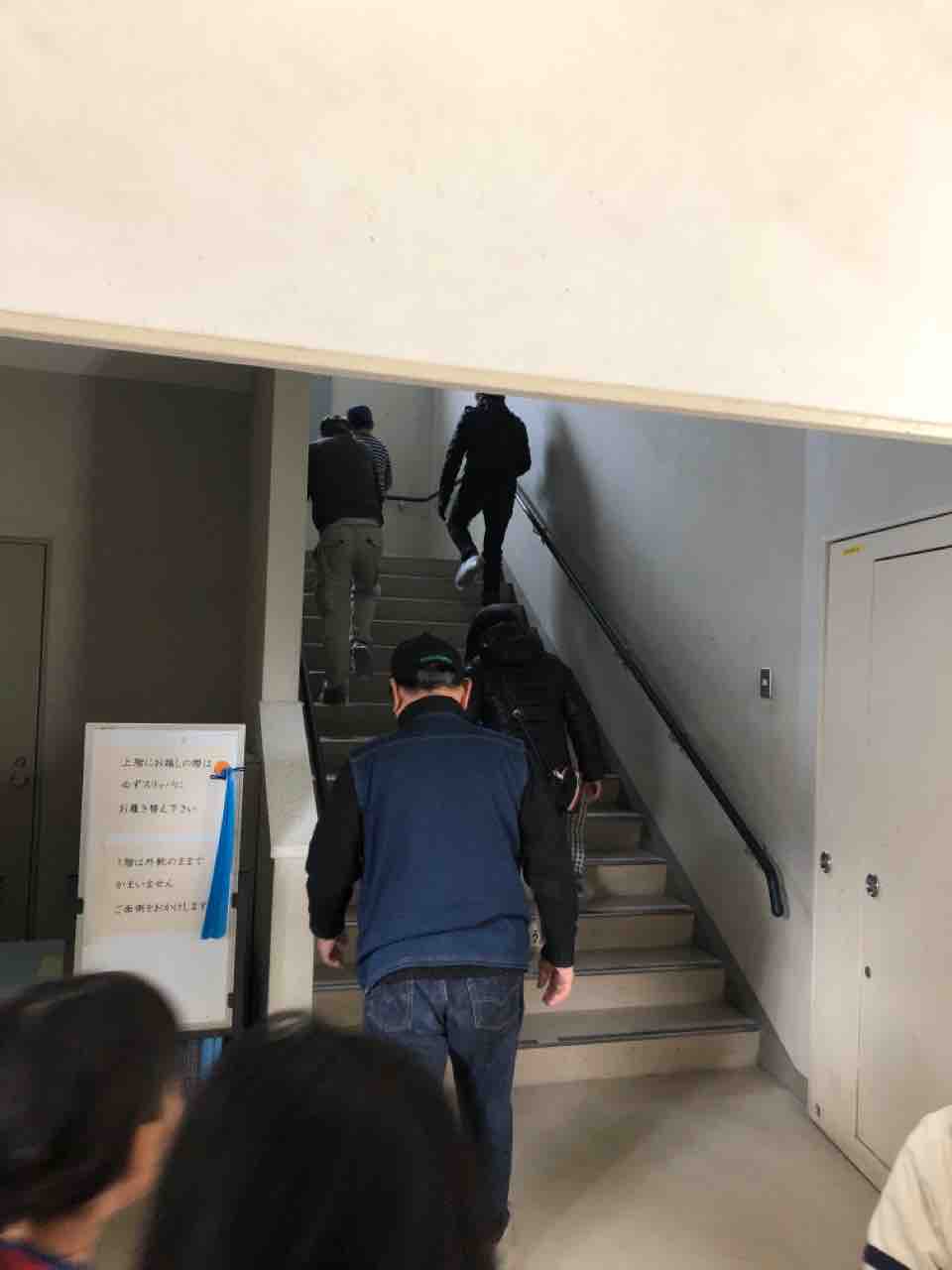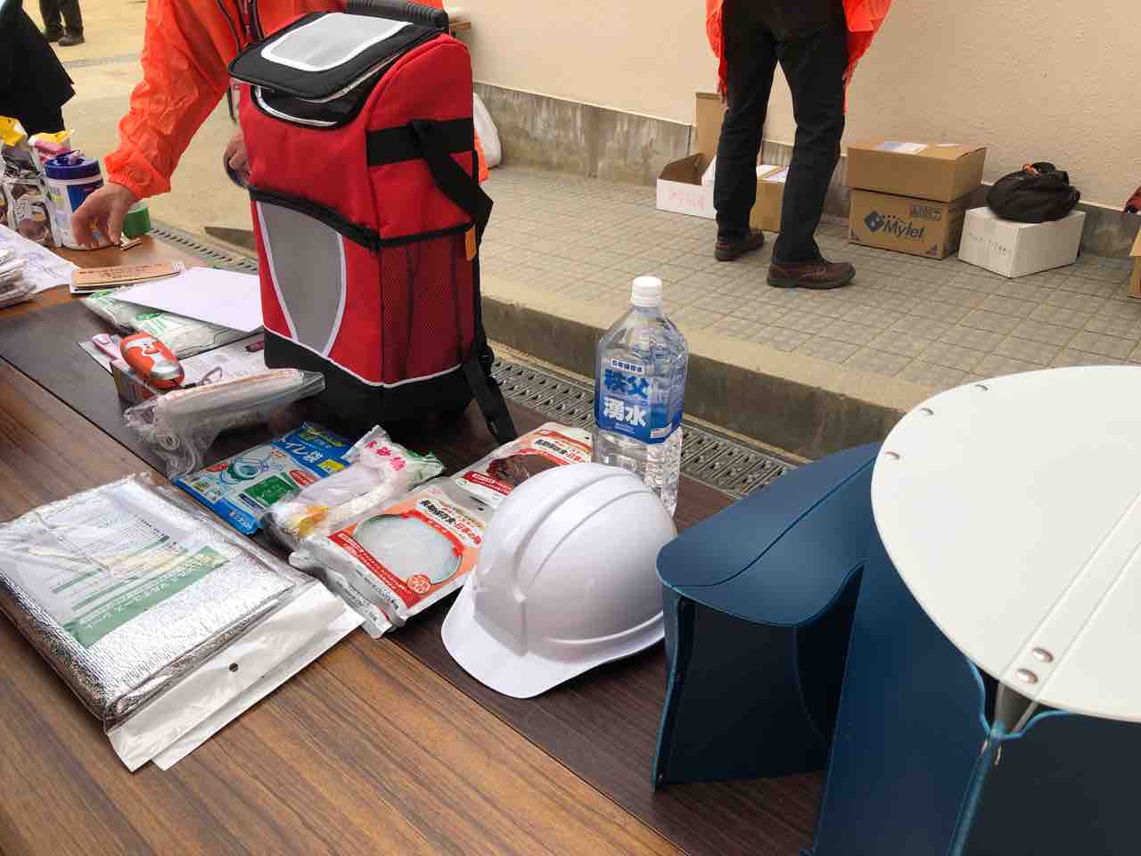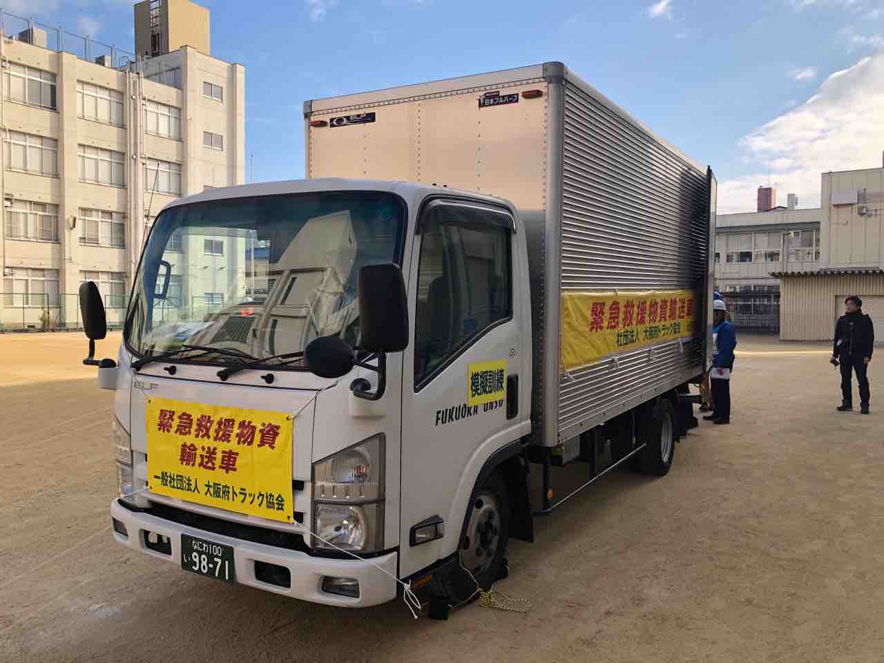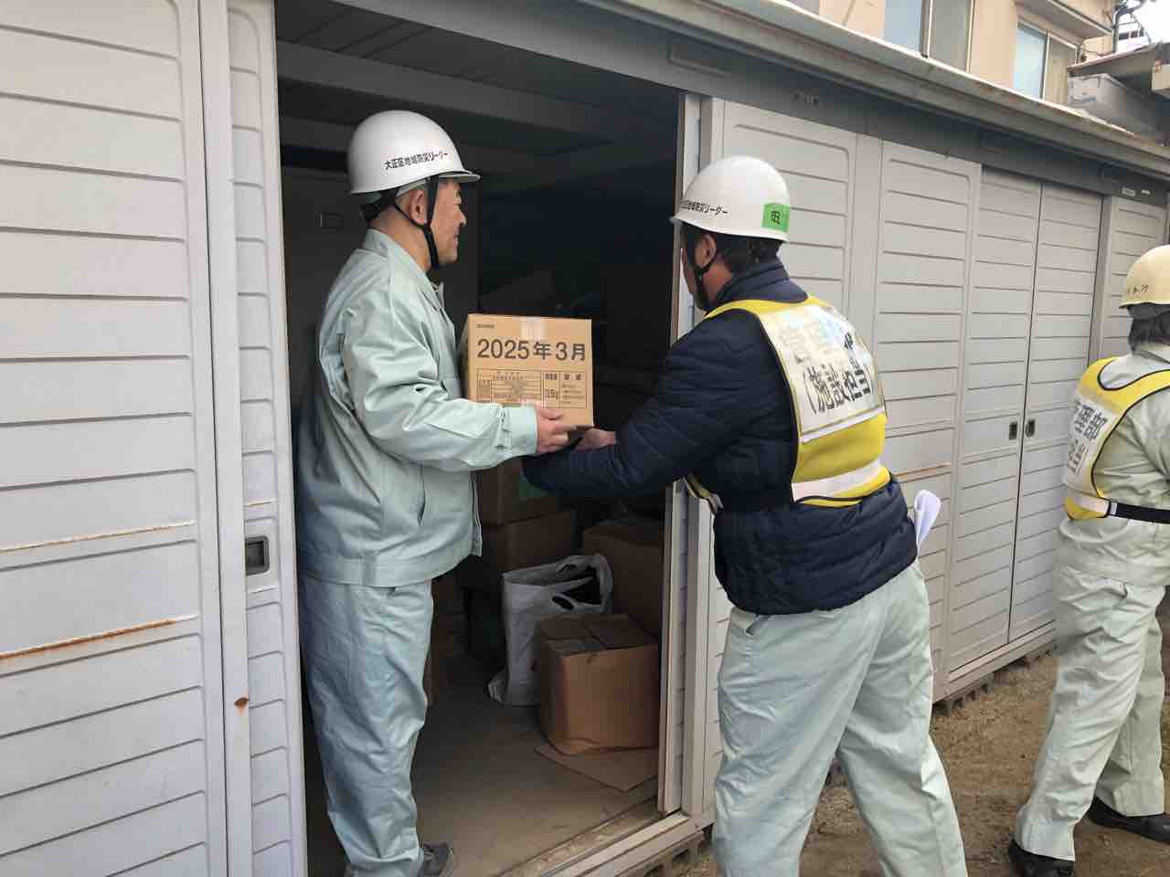 1階にこれまであった避難所用備蓄倉庫の物資を最上階の倉庫へみんなで確認しながら移し替え。また、一般財団法人大阪トラック協会のご協力をいただいて避難所物資の輸送訓練。