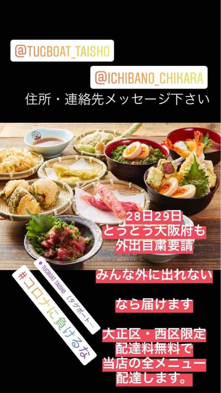 TUGBOAT_TAISHO(タグボート大正)内の「イチバノチカラ」が、大正区・西区限定ではありますが、全メニューの無料配達をしています。