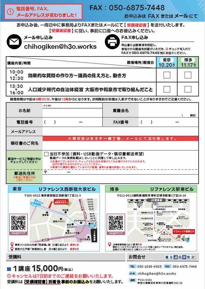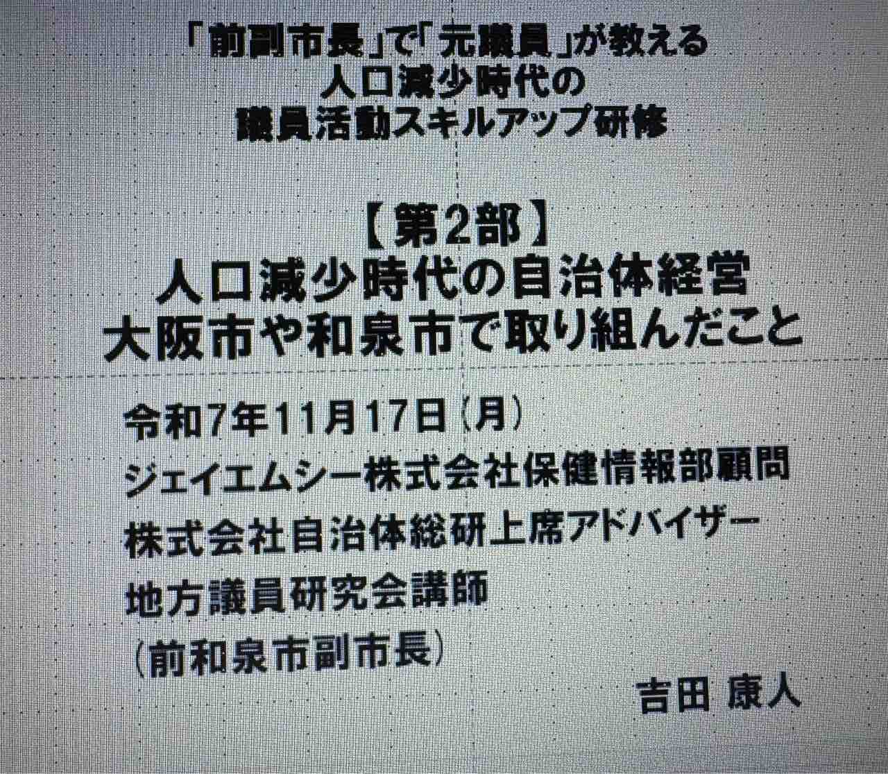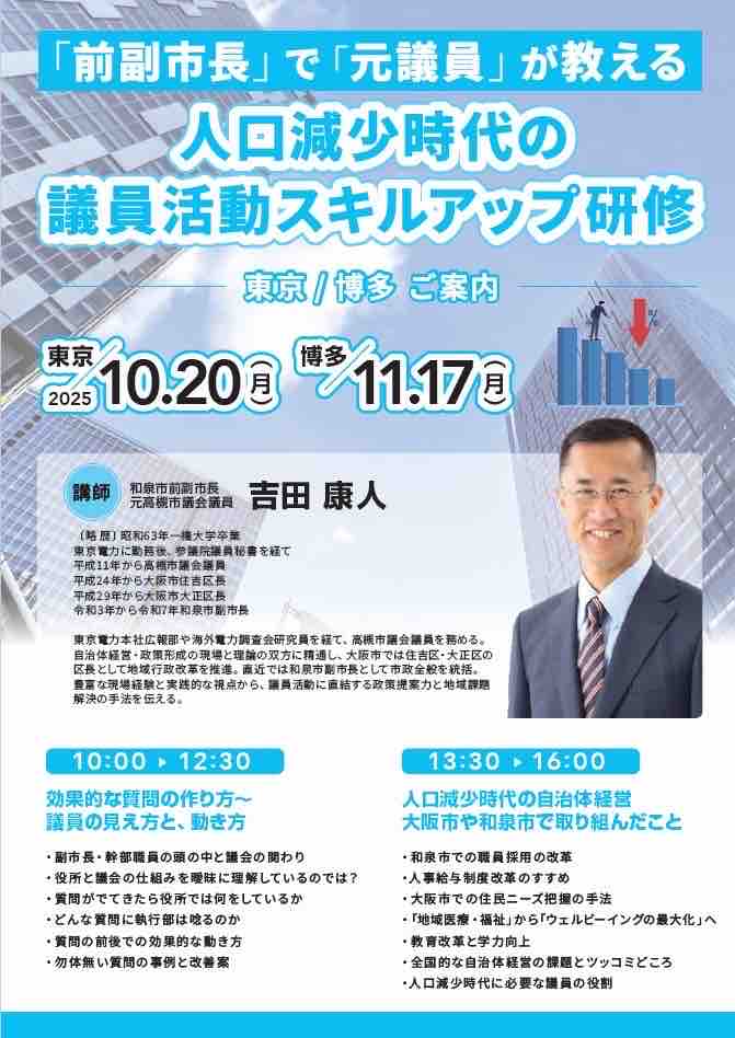 9月20日付( https://log.yoshidayasuto.jp/archives/5914656.html )・10月9日付( https://log.yoshidayasuto.jp/archives/5916379.html )「やすとログ」でご案内した吉田康人が講師を務める「人口減少時代の議員活動スキルアップ研修」(地方議員研究会( https://chihogiken.jimdofree.com/ ))。博多での開催が11月17日(月)に迫ってきました。
