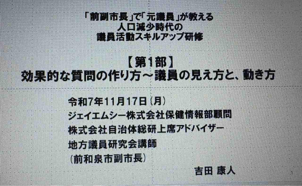 10月20日(月)の研修と同テーマ・内容ですが、吉田康人から説明を加えるスライドの数をグッと減らします。しっかり、じっくりご説明するためです。さらに、議会質問原稿の具体例(ほかから引用したもの、私自身が書いたもの)を何点か、スライド付きで解説します。AIのチェックも受けています(笑)。